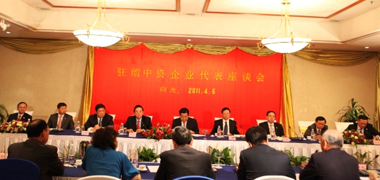 2011年4月5日上午,正在缅甸进行友好访问的全国政协主席贾庆林在仰光主持召开了驻缅中资企业代表座谈会,