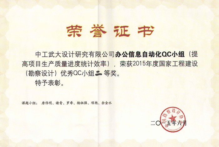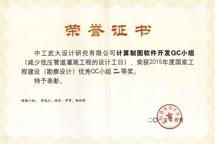 2015年6月30日至7月3日,在由中国勘察设计协会举办的国家工程建设(勘察设计)优秀QC小组成果发布及表彰会上,我公司“办公信息自动化QC小组”报送的“提高项目生产质量进度统计效率”成果和“计算制图软件开发QC小组”报送的“减少低压管道灌溉工程的设计工日”成果均荣获2015年度国家工程建设(勘察设计)优秀QC小组二等奖。