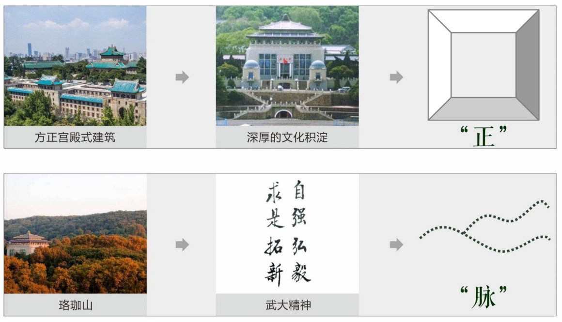 武汉大学校内建筑多以方正宫殿式的建筑群为主,远远望去古朴典雅、正气浩然。珞珈山更是武汉大学校园主峰,也是武汉大学的精神象征,因此扬浩然正气、传脉脉生机亦是此次的设计关键。