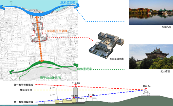 最终第一教学楼呈现南望珞珈山,北临东湖水,也表达了显山露水的设计理念。