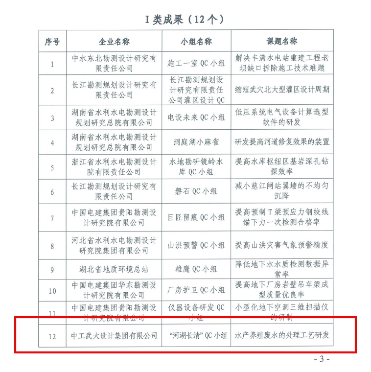 本次竞赛中,河湖长清QC小组的“水产养殖废水的处理工艺研发”被评为Ⅰ类,水工隧洞BIM设计QC小组的“减少引调水工程中输水隧洞设计工日”、淤泥堆场技术攻关QC小组的“减少农村湖泊淤泥堆场余水入湖二次污染”和项目生产计划管理QC小组的“降低项目生产情况统计错误率”被评为Ⅱ类。其中河湖长清QC小组的“水产养殖废水的处理工艺研发”被推荐参加中国勘察设计协会举办的QC小组活动竞赛。