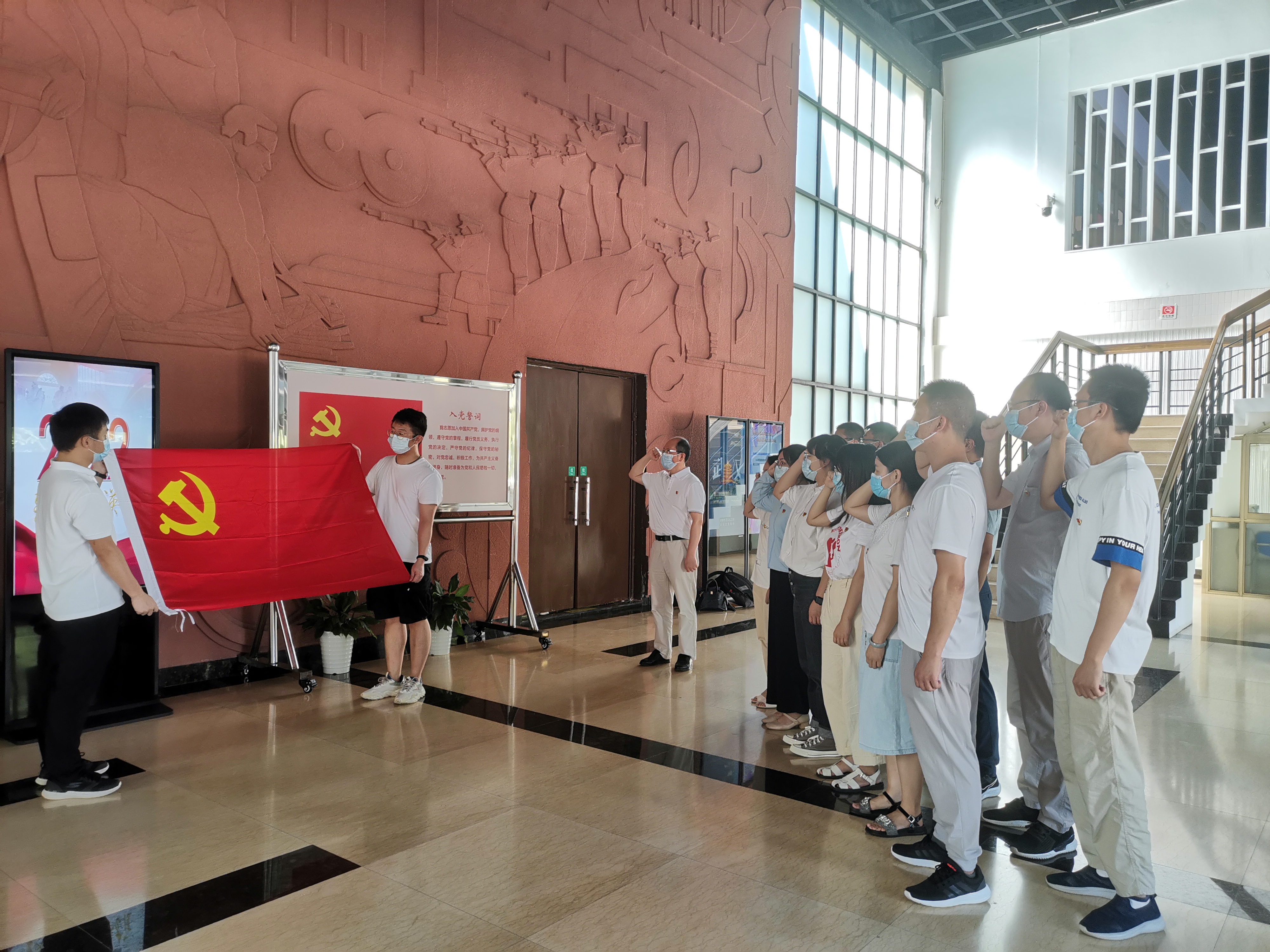 在二七纪念馆内, 党员同志们佩戴党员徽章,整齐队列、庄重肃立,在支部书记王强同志带领下,举起右手,庄严重温入党誓词。