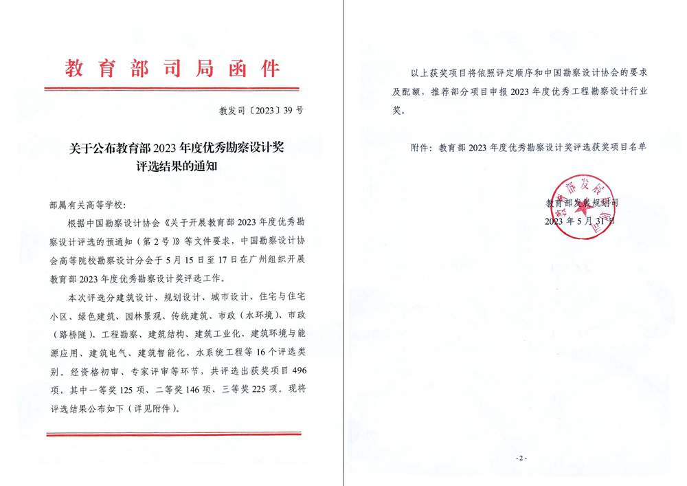 近日,教育部规划司公布了2023年度优秀勘察设计奖评选结果。公司12项成果在众多优秀作品中脱颖而出,分别获得一等奖1项、二等奖3项、三等奖8项,充分展现了公司在勘察设计领域的技术实力和创新能力。