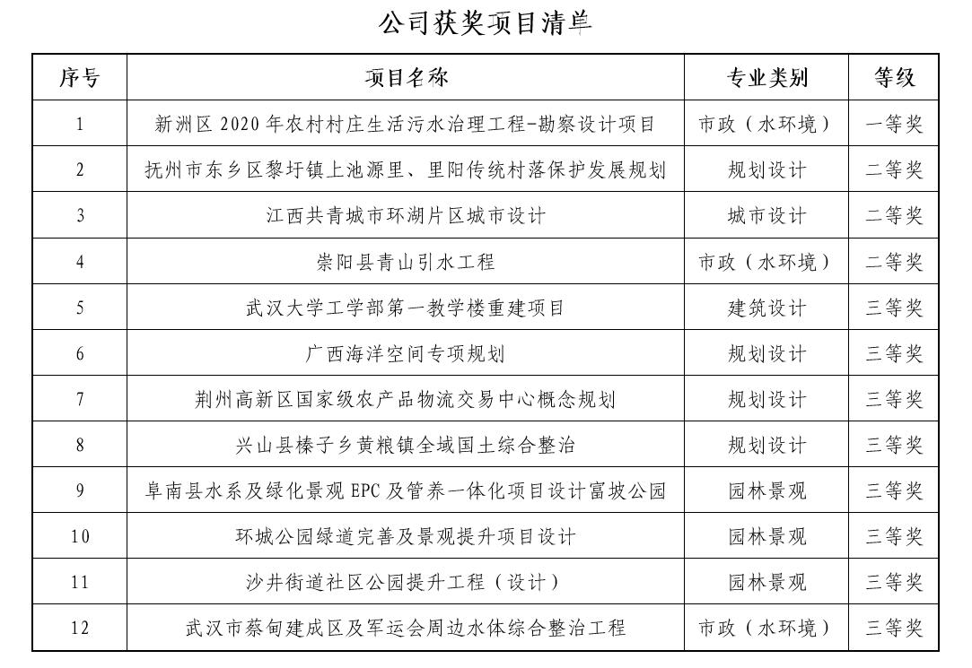 其中,《新洲区2020年农村村庄生活污水治理工程-勘察设计项目》获市政(水环境)类一等奖;《抚州市东乡区黎圩镇上池源里、里阳传统村落保护发展规划》、《江西共青城市环湖片区城市设计》、《崇阳县青山引水工程》分别获得规划设计类、城市规划类、市政(水环境)类二等奖;《武汉大学工学部第一教学楼重建项目》、《广西海洋空间专项规划》、《阜南县水系及绿化景观EPC及管养一体化项目设计富坡公园》、《武汉市蔡甸建成区及军运会周边水体综合整治工程》等8项成果获三等奖。