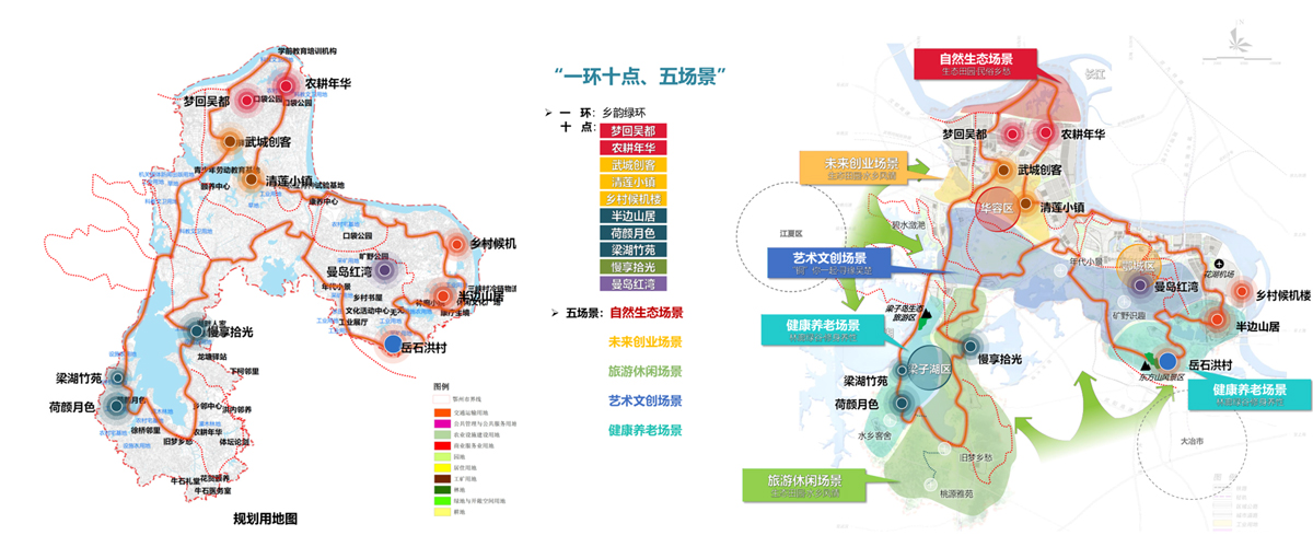 自承接规划以来,公司项目团队通过对鄂州市全域441处资源点进行5次现场踏勘,5次征求意见,并研究国内外数十个优秀相关案例,以“缝合山水,链接城市,散点串珠,生态绿环”的设计思路,构建了“一环十点、五场景”的规划结构。其中,“一环”指乡韵绿环,全长406千米;“十点”包括梦回吴都、农耕年华、武城创客、清莲小镇、乡村候机楼、半边山居、荷颜月色、梁湖竹苑、慢享拾光、曼岛红湾,围绕绿环形成“八景”,即三江拾梦、绿野仙踪、康疗生境、年代小景、慢享拾光、荷颜月色、旧梦乡愁、农耕驿站。“五场景”指自然生态场景、未来创业场景、旅游休闲场景、艺术文创场景和健康养老场景。