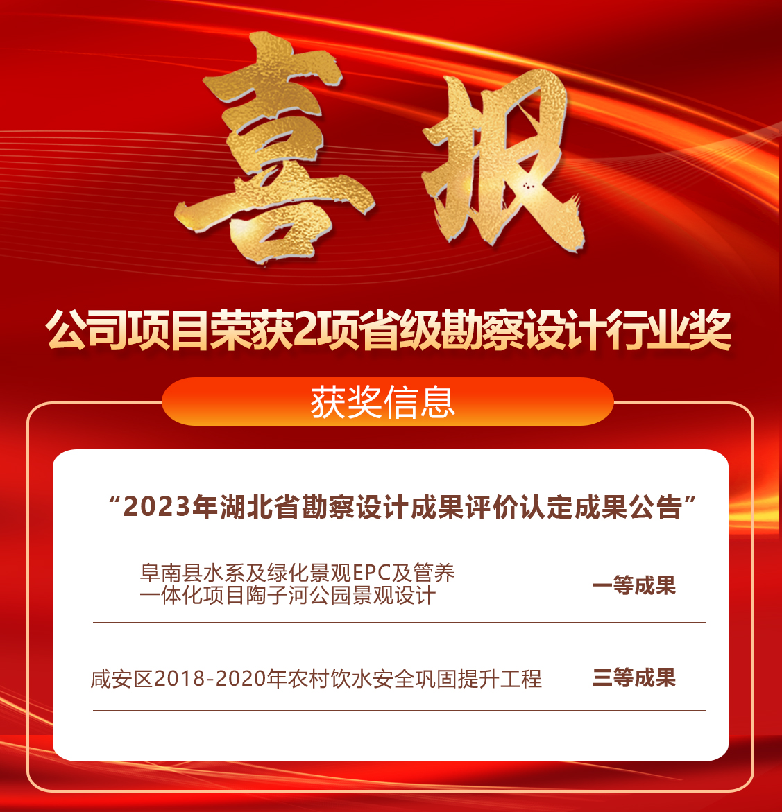 近日,湖北省勘察设计协会发布《2023年湖北省勘察设计成果评价认定成果公告》,经评审专家层层遴选,公司项目共荣获2项省级勘察设计成果奖荣誉,成绩斐然。