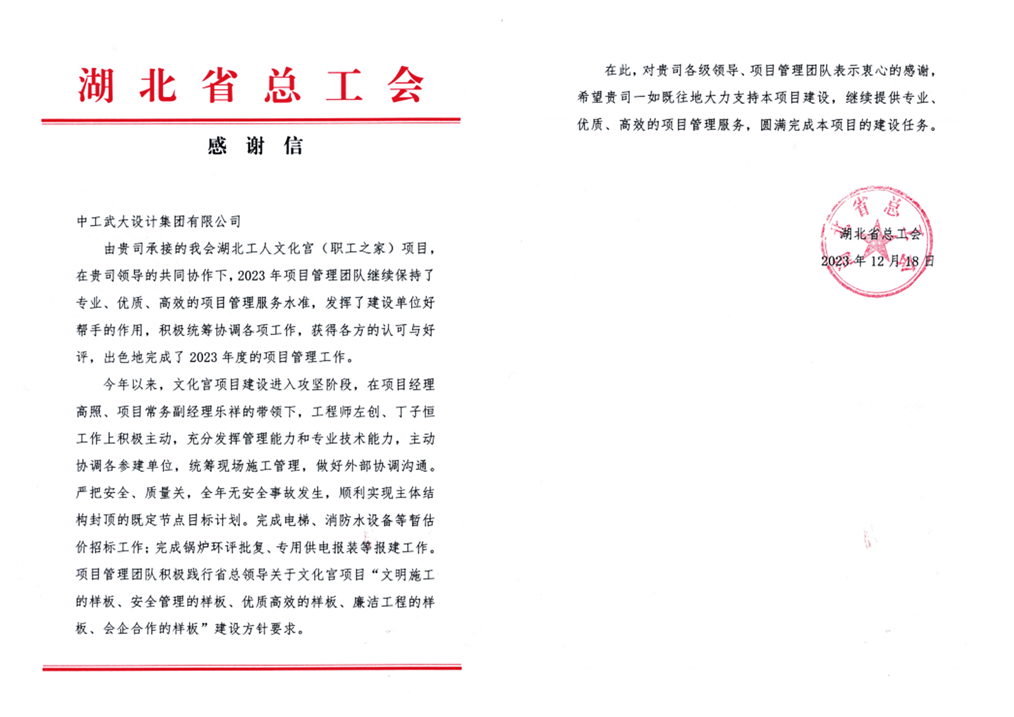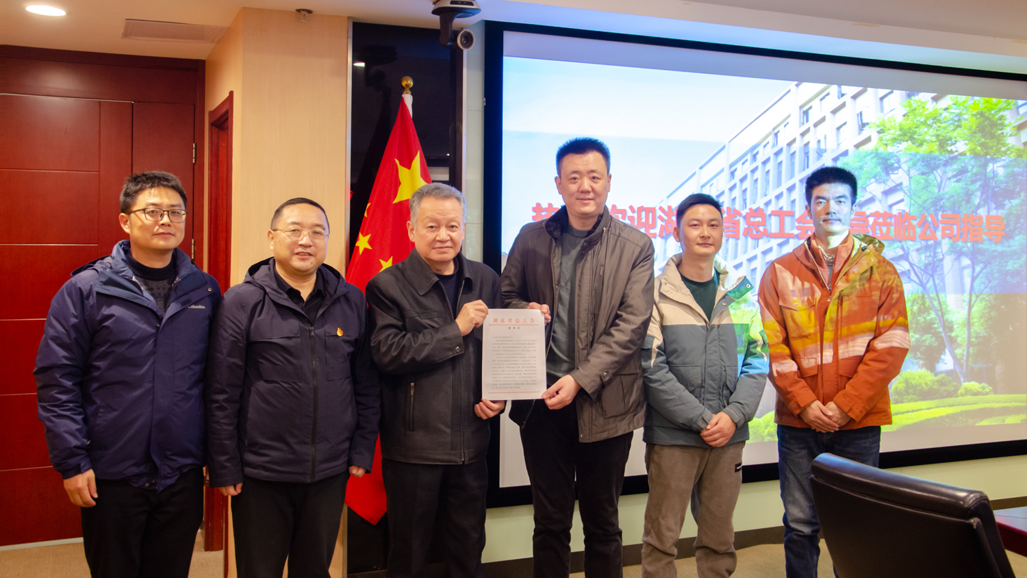 12月19日,湖北省总工会基建办科长蒋将,刘松一行,代表湖北省总工会专程为我公司送来项目感谢信。公司工会主席、副总经理席青骥,公司副总经理王志臣及湖北工人文化宫(职工之家)项目管理团队相关负责人参加了接待活动。
