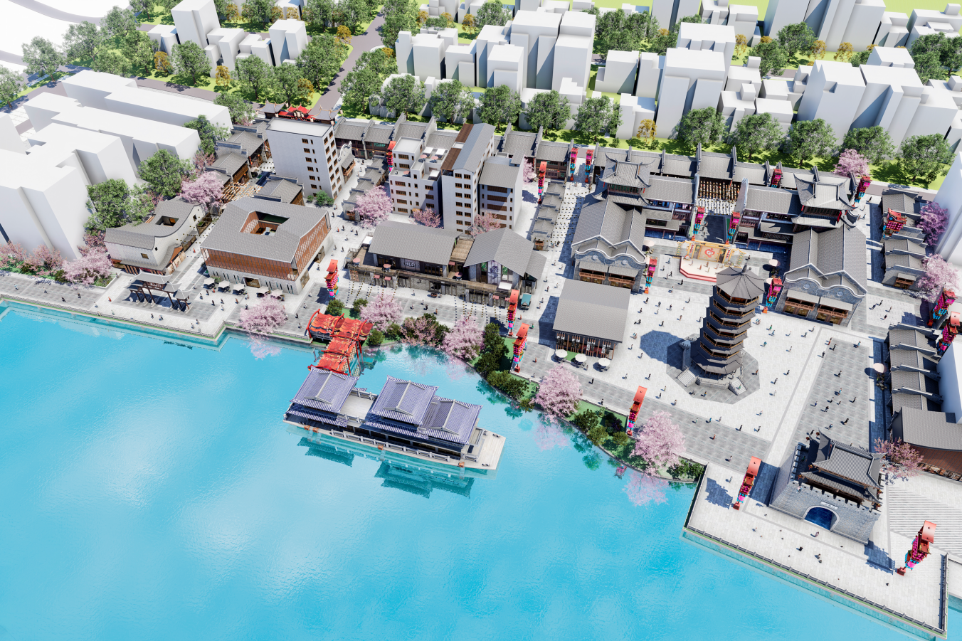 项目位于湖北省阳新县老城区南门河,占地面积约43300㎡(65亩),地上总建筑面积21394.97㎡。公司负责的设计任务涵盖以下三方面:(1)水环境治理,包括沿岸线边坡整治;(2)配套基础设施工程,包括沿线的建筑立面整治、照明提升、给排水管网改造、电力电信线路改造、防护通道、智慧平台等;(3)配套建筑工程,包括商业街、服务中心、停车场及充电桩等。