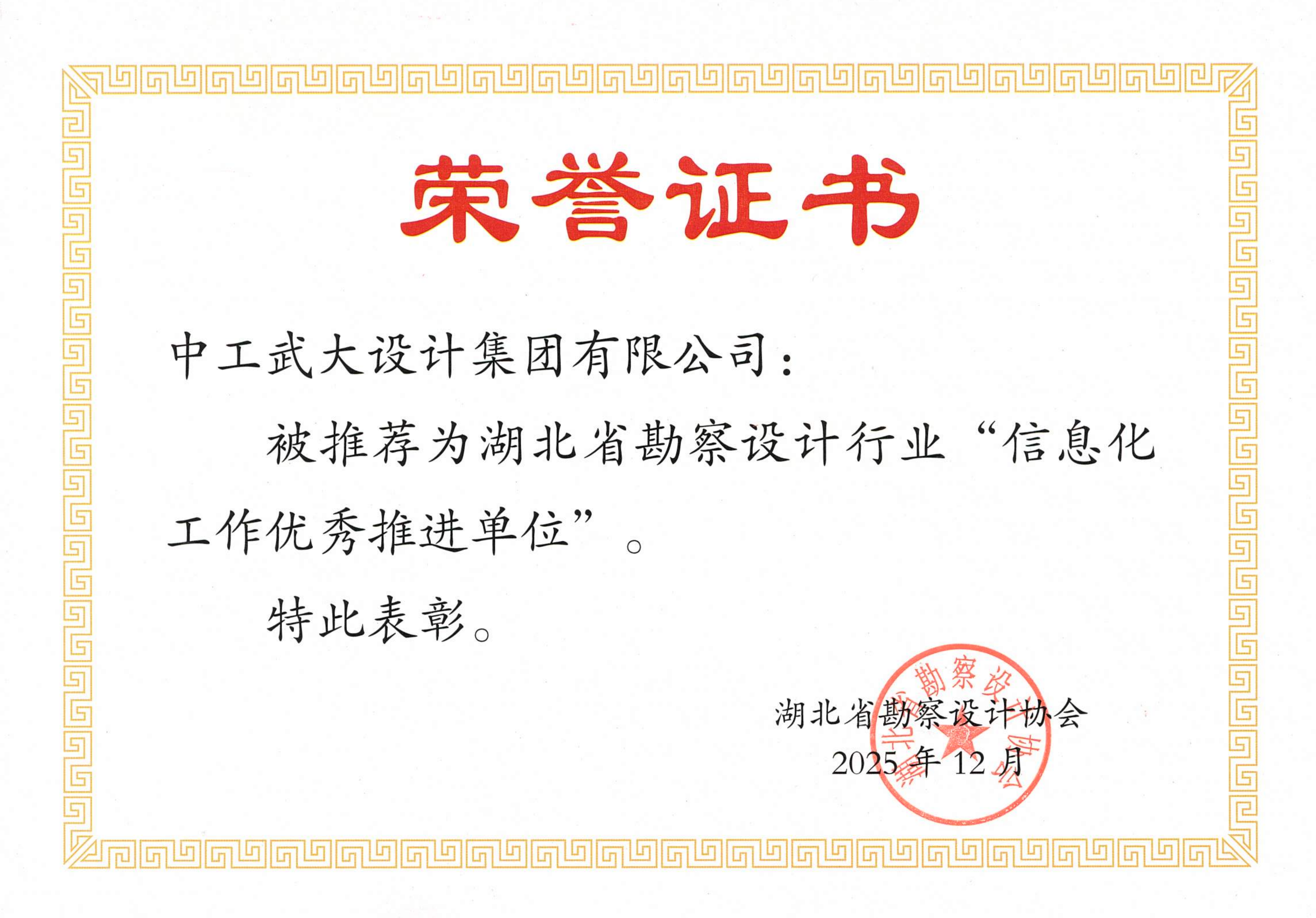 近日,湖北省勘察设计协会正式发布《关于表彰湖北省勘察设计行业信息化工作优秀推进单位、推进者和服务商的通报》。在2025年度评选中,公司被授予 “信息化工作优秀推进单位” 荣誉称号,两名员工被授予“信息化工作优秀推进者”称号。